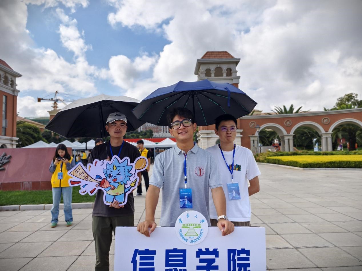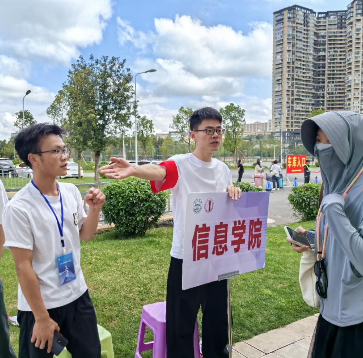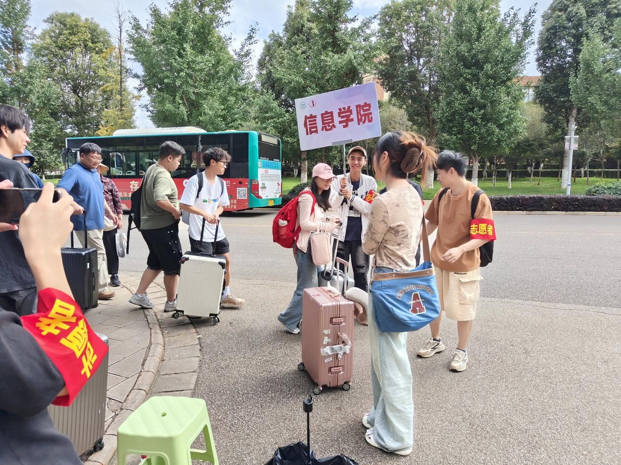 清晨7:30,参与迎新工作的志愿者们全部准备就绪。云大北门、东门、西门、西二门均有学院志愿者手持迎新引导牌守候,为新生及家长引路、指明摆渡车乘坐点、叮嘱宿舍区所在位置。