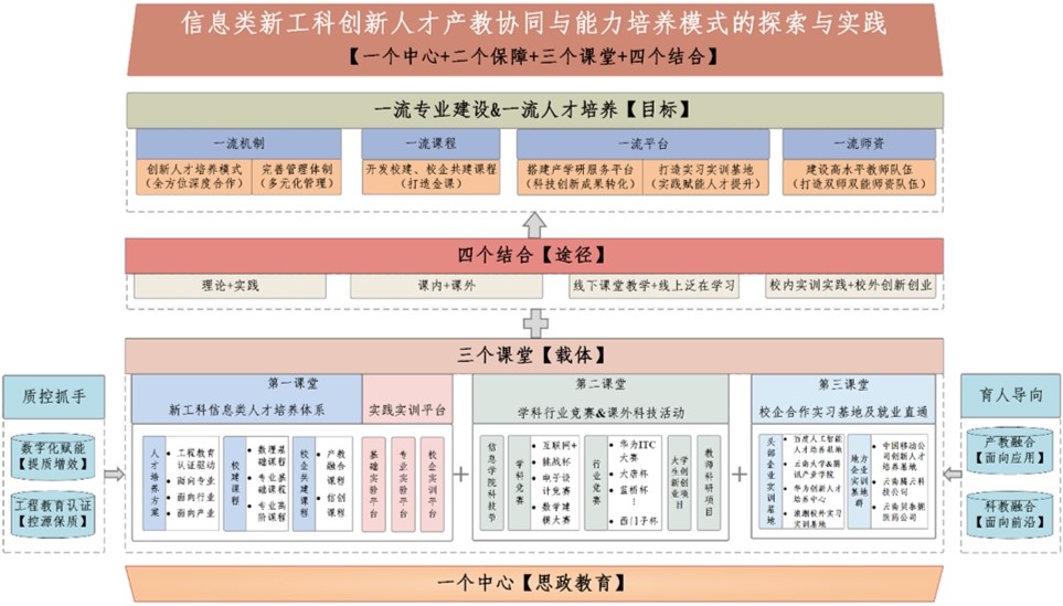 学院提出“一个中心、两个保障、三个课堂、四个结合”的地方综合性大学信息类新工科产教协同与能力培养模式。