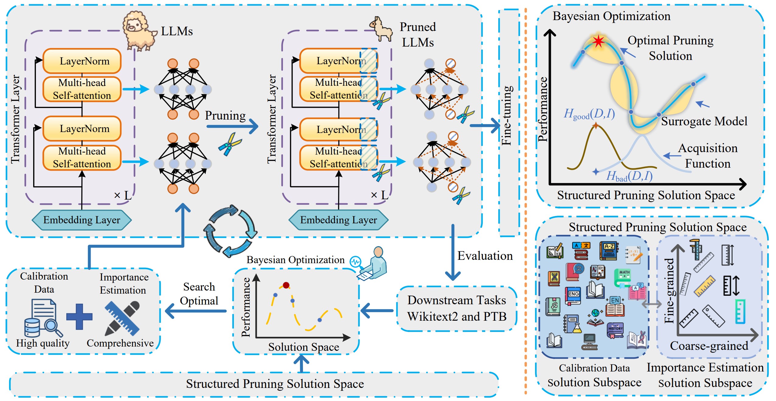 现有的结构化剪枝方法中配准数据的选择是随机的,重要度估计指标是固定的,导致剪枝模型的性能下降。该研究提出了一种基于样本感知的大型语言模型自适应结构化剪枝框架。其核心在于针对不同样本可采取不同剪枝策略,如随机选择的校准数据和固定的重要性估计指标,以解决现有方法的局限性,优化和压缩大模型。该研究构建了一个结构化的修剪解决方案空间,并使用贝叶斯优化来自适应地识别最佳校准数据和重要性估计指标,以有效地去除冗余参数。实验结果表明,所提出方法在不同的大模型和剪枝率要求下优于传统方法。