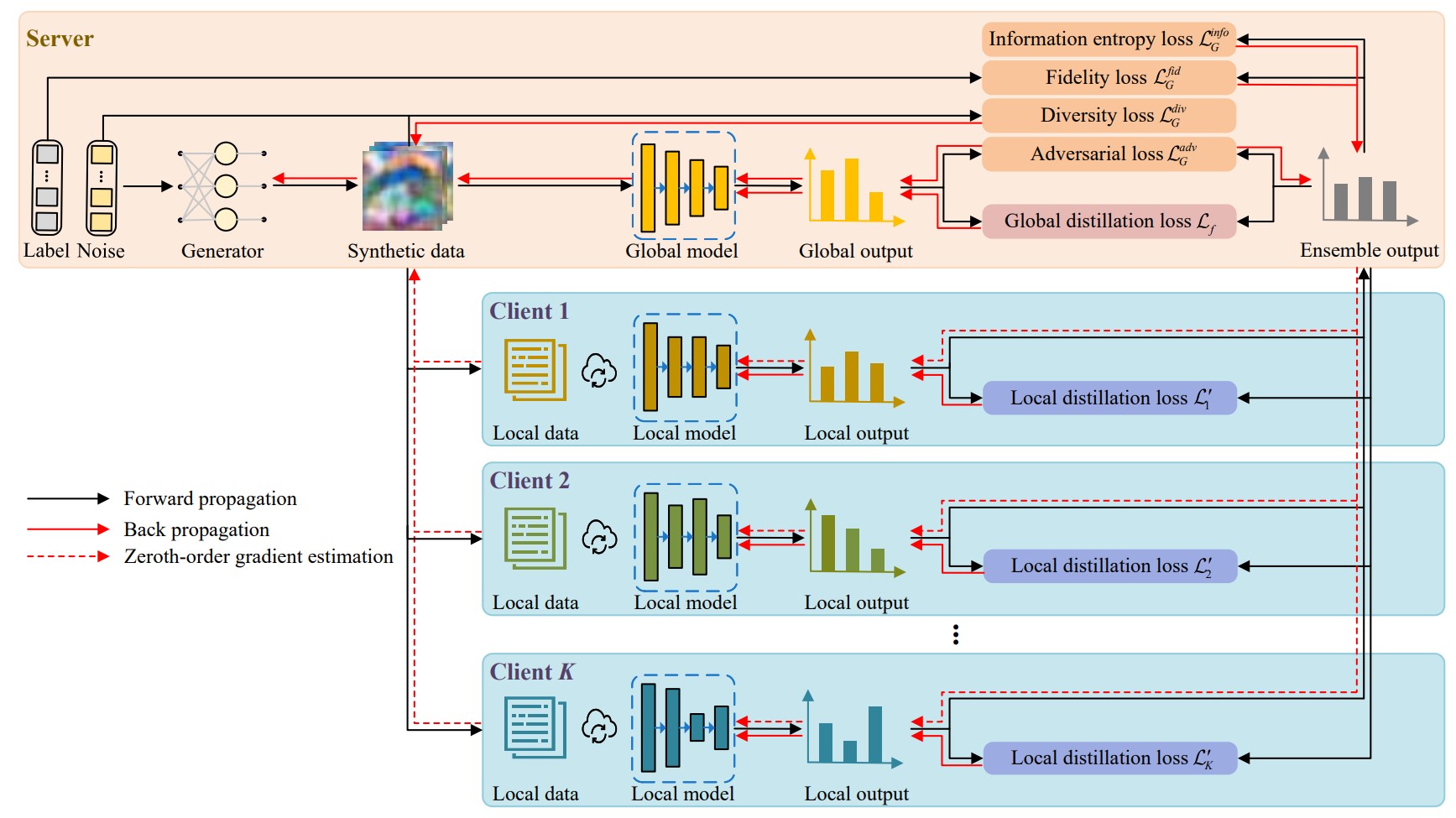 无数据联邦学习可在服务器端训练一个生成器来直接合成特定任务的数据样本以进行知识迁移。然而,生成器的更新规则需要客户端共享其本地模型进行白盒访问,这极大地削弱了基于蒸馏的联邦学习所带来的优势。同时结合基于蒸馏和无数据联邦学习优势,该研究通过零阶梯度估计探索一种无数据的黑盒联邦学习框架,其对生成器的训练目标进行重构以兼顾合成数据的保真度、可迁移性、多样性和分布均衡性,并以黑盒优化的方式估计客户端本地模型的梯度以完成生成器的训练,无需借助任何辅助数据或共享模型参数。在大规模图像分类数据集和网络架构上进行的实验表明所提出的方法在处理数据异构性、模型异构性、通信效率和隐私保护方面的优越性。