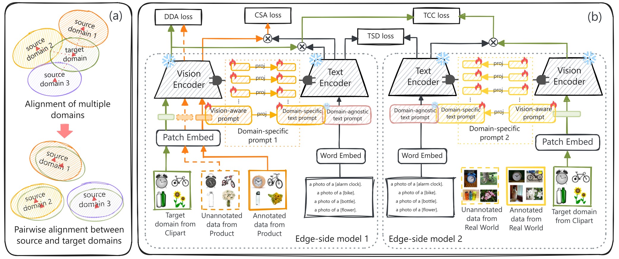 传统的多源少样本自适应存在低资源场景下边缘设备负载过高的问题。考虑到CLIP具有天生的语言监督优势,利用具有即插即用特性的提示能够高效地迁移CLIP,该研究探究可上传的多源少样本领域适应方案。其属于一种去中心化的边缘学习,仅需提供少量的被标注的源域样本,而大部分源域数据是无需标注的。基于此,该研究提出了一个视觉感知的多模态提示调优框架,其中视觉提示指导领域特定的文本提示,以保持语义判别性并感知领域信息。在多个多模态数据集上的实验结果表明,所提出的方法优于以往的提示学习方法。